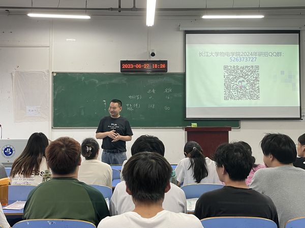 在此次宣传活动中,肖循副院长向我院师生介绍了长江大学的基本情况、研究生招生政策和流程,详细介绍了长江大学物理与光电工程学院学科建设、师资力量、科研成果、研究生培养等方面情况,诚挚欢迎同学们积极报考。