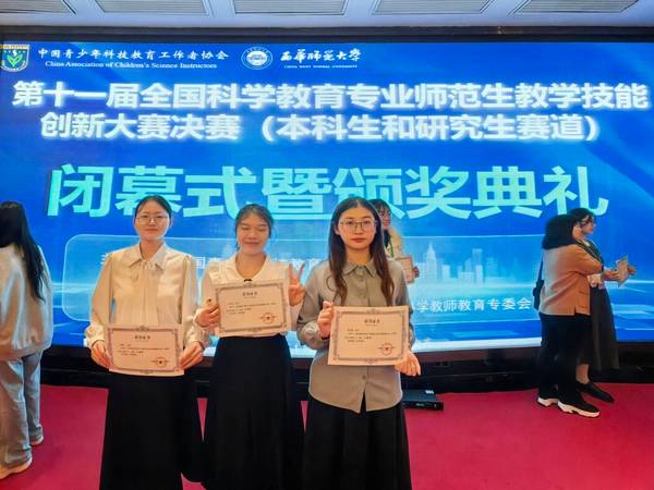 12月1日至3日,由中国青少年科技教育工作者协会主办,西华师范大学承办的第十一届全国科学教育专业师范生教学技能创新大赛决赛(本科和研究生赛道)在西华师范大学华凤校区举行。英国上市公司官网365胡蓉、姜心懿、李卓群等3名选手在决赛中敢打敢拼,最终取得了3项三等奖的成绩。