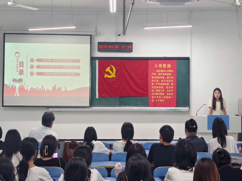 6月20日下午,教工党支部书记周鹏、学生党支部书记王超然分别以“强化党纪教育,提高师德师风水平”和“做讲党性守党规严党纪的时代新人”为题,为师生党员讲授专题党课。党课聚焦“六大纪律”,要求全体党员始终牢记党的纪律是刚性约束,守好纪法“总开关”,牢牢守住底线红线,党员老师要严守师德,教书育人,学生党员要模范遵守校纪校规,发挥模范带头作用。