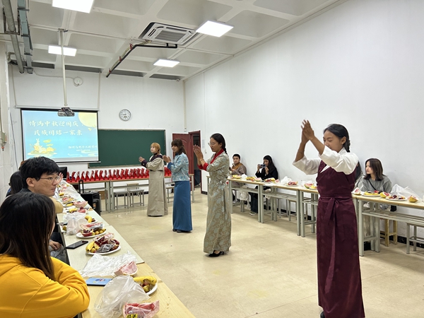 茶话会伊始,戴俊老师代表学院为同学们送上节日的问候。随后,藏族同学为在场师生献上《纳瓦吉瓦》、《益久措姆》、《幸福的藏家人》等极具民族特色的歌舞表演。