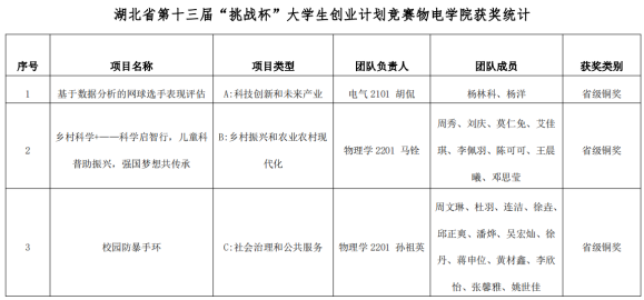 6月18日至6月22日,由共青团湖北省委、湖北省教育厅、湖北省人力资源和社会保障厅、湖北省科学技术协会、湖北省学生联合会共同主办的第十三届“挑战杯”大学生创业计划竞赛获奖名单揭晓。我院《基于数据分析的网球选手表现评估》《乡村科学家—儿童科普助振兴,强国梦想共传承》《校园防暴手环》三个项目获得铜奖。