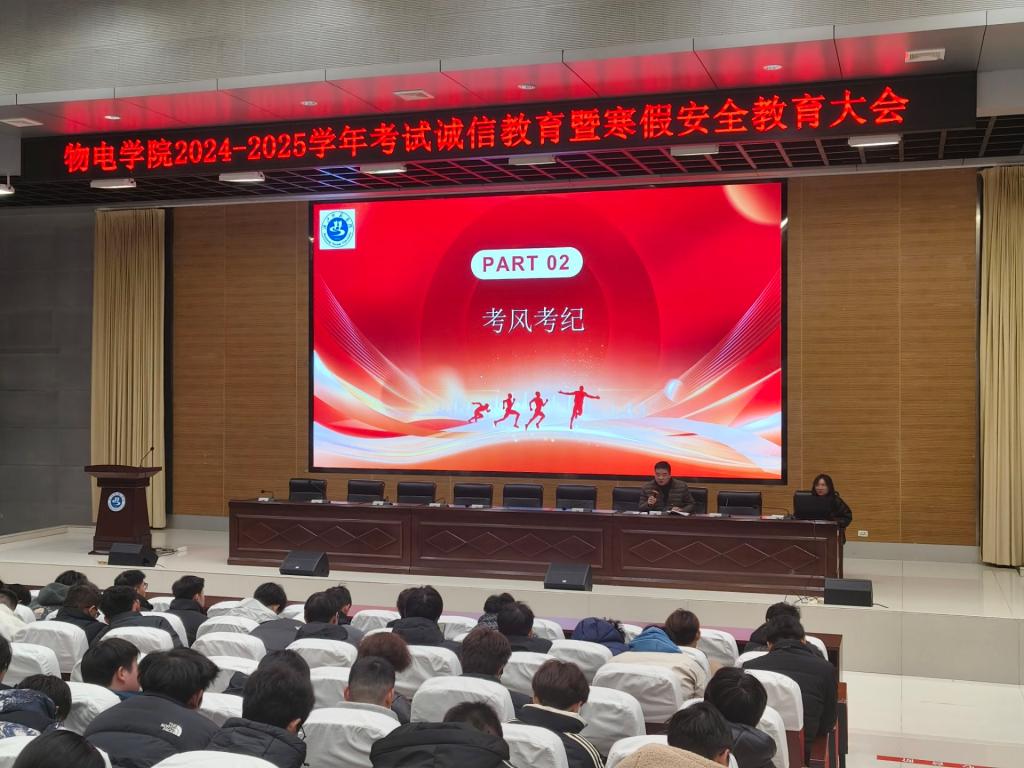 为严肃考风考纪,营造良好的期末考试氛围,增强学生诚信意识和安全防范意识,12月29日晚,英国正版365官方网站在图书馆学术报告厅召开诚信考试教育暨寒假安全教育大会。院分党委副书记戴俊、学工办主任尹诗雅和2024级全体同学参加会议。