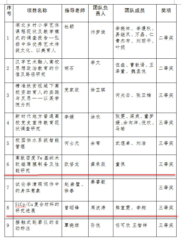 近日,湖北省第十三届“挑战杯”大学生课外学术科技作品竞赛落下帷幕,我校共有9项作品获奖,其中我院《高致密度Fe基纳米软磁薄膜制备及性能研究》《SiCp/Cu复合材料的研究进展》2项作品荣获全省三等奖。
