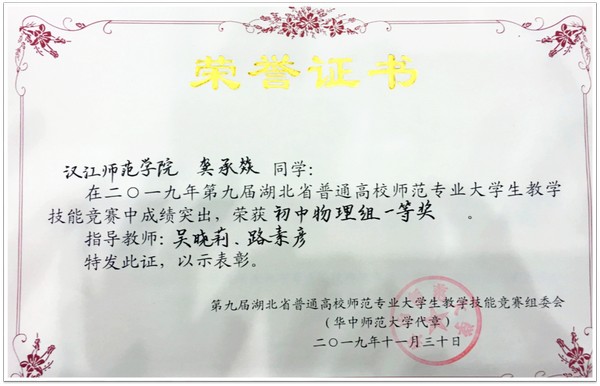 2019年11月,该同学代表我校参加湖北省“第九届普通高校师范专业教学技能竞赛”初中物理组,荣获初中物理组一等奖。