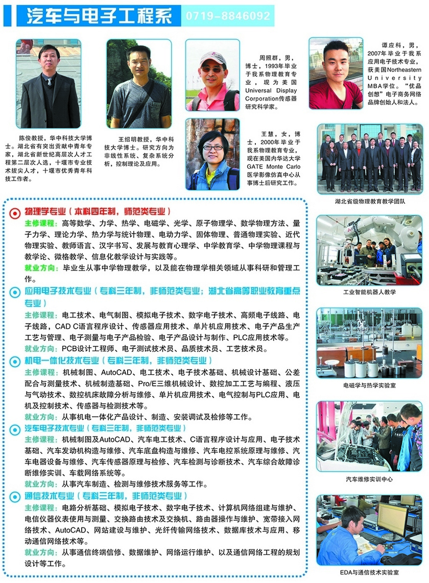 汽车与电子工程系创办于1977年,经过多年建设,办学水平和实训条件达到了较高的水平,目前已拥有一个物理学本科专业,以应用电子技术专业(湖北省重点专业)为龙头,机电一体化技术专业、汽车电子技术专业、通信技术专业为依托的专业群。其中应用电子技术专业为全校第一个湖北省高等学校职业教育重点专业,汽车电子技术专业为湖北省高等学校战略性新兴(支柱)产业人才培养计划实施专业。