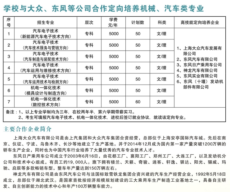 其中汽车电子技术专业(汽车检测与维修方向)、(汽车技术服务与营销方向)为上海大众汽车发展有限公司、东风汽车有限公司、东风日产乘用车公司、神龙汽车有限公司、东风实业有限公司等公司定向培养,学生毕业后直接到上述企业就业。