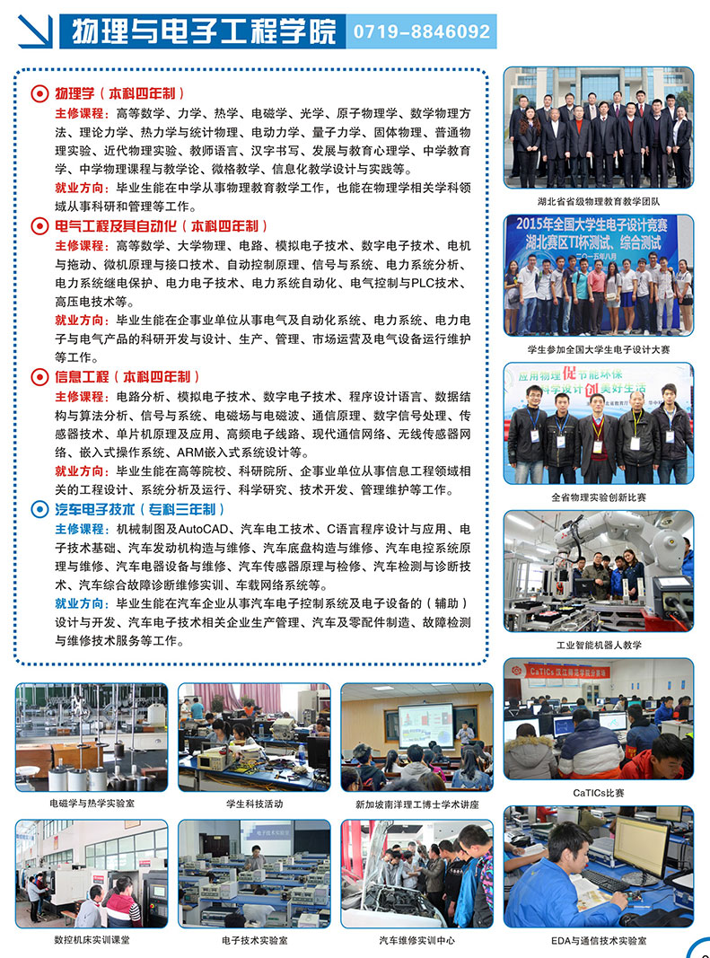 英国正版365官方网站由1978年成立的郧阳师范专科学校物理系创办,前身为华中师范学院郧阳分院物理科,为学校最早开办5个专业的教学单位之一。经过多年的发展,师资队伍不断加强、实践教学条件不断完善、教科研水平和人才培养质量不断提升,目前已拥有物理学、电气工程及其自动化、信息工程三个本科专业,以及汽车电子技术专科专业。其中信息工程本科专业前身应用电子技术专业为全校第一个湖北省高等职业教育重点专业,汽车电子技术专业为湖北省高等学校战略性新兴(支柱)产业人才培养计划实施专业。