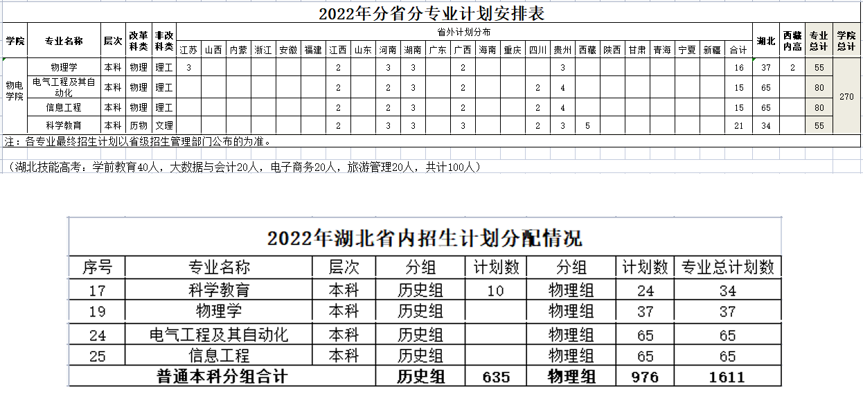 我校2022年湖北省内招生计划